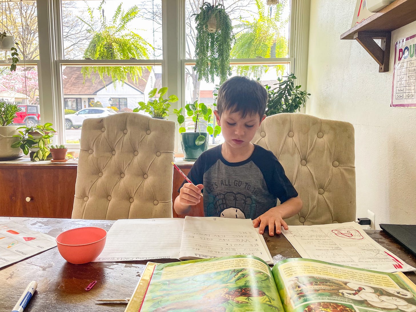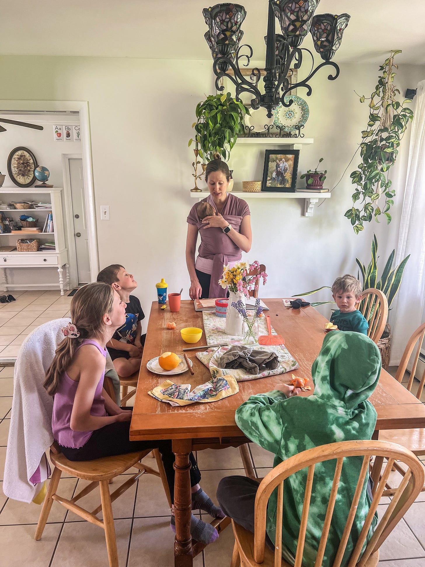 I begin school with the older kids (ages 8 and 10). My husband walks our three- and six-year-old to a nearby neighbor’s house (an older friend from our life group) for an hour of play, which is an incredible gift to give someone in a newborn season! I sit down with the big kids and we dive right in and make good use of this time, free from the usual distraction of little boys. We do math lessons, read together, spelling, and math flashcards (the essentials). I’m also holding the baby, who refuses to be put down today. One hand rocking, one hand pointing at math problems— a real balancing act and a tangible test of patience!