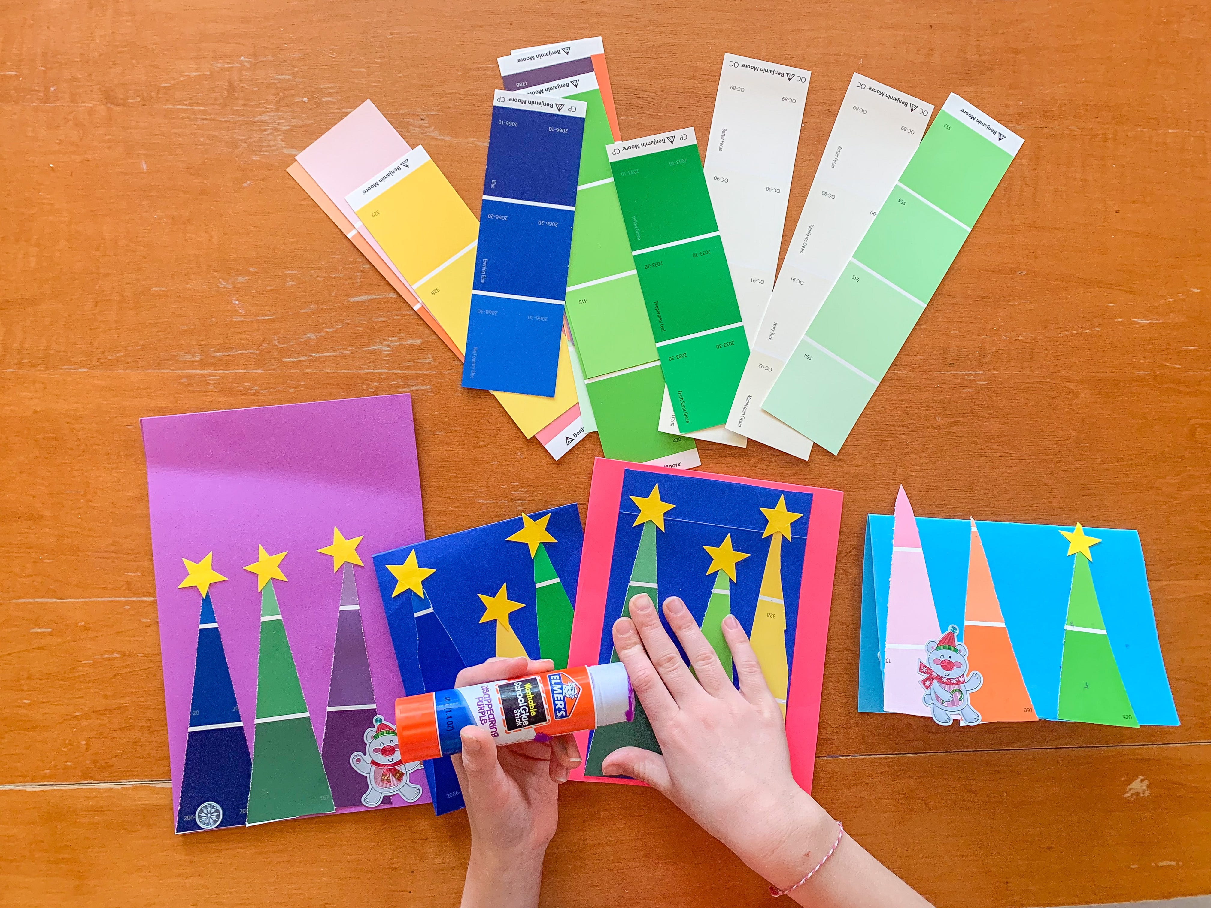 December 11- Make paint chip tree cards. We started doing this years ago and still make them each year! All you need is a few paint chip samples from your paint or hardware store (cut into the shape of trees) and some paper.