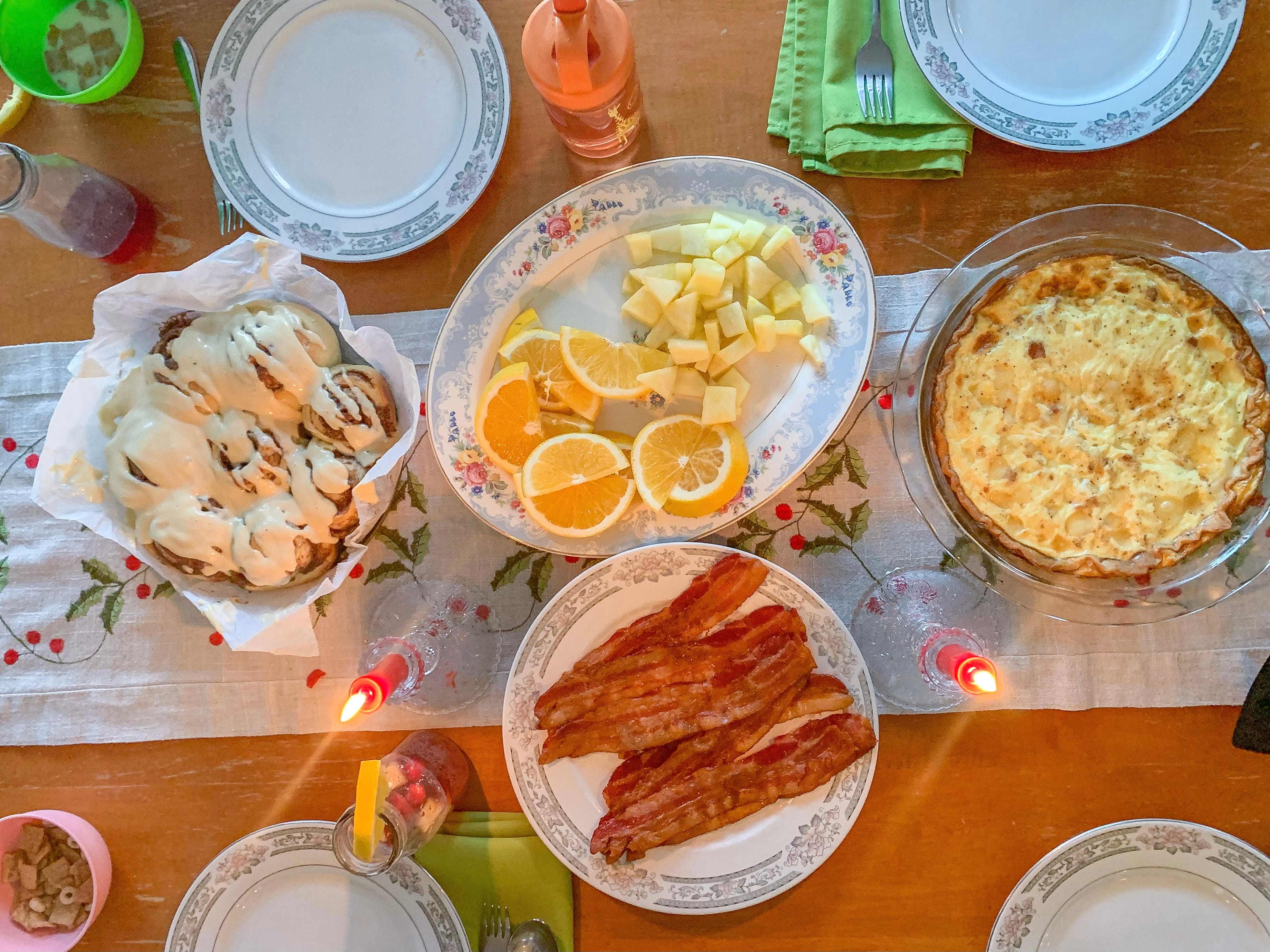 December 25- Sing Happy Birthday to Jesus! We always have our favorite breakfast for Christmas morning— cinnamon rolls, ham and cheese quiche, bacon, fruit, and hot cocoa. I love taking time before all the other festivities happen to gather as a family and have a special Christmas breakfast and give thanks to the Lord.