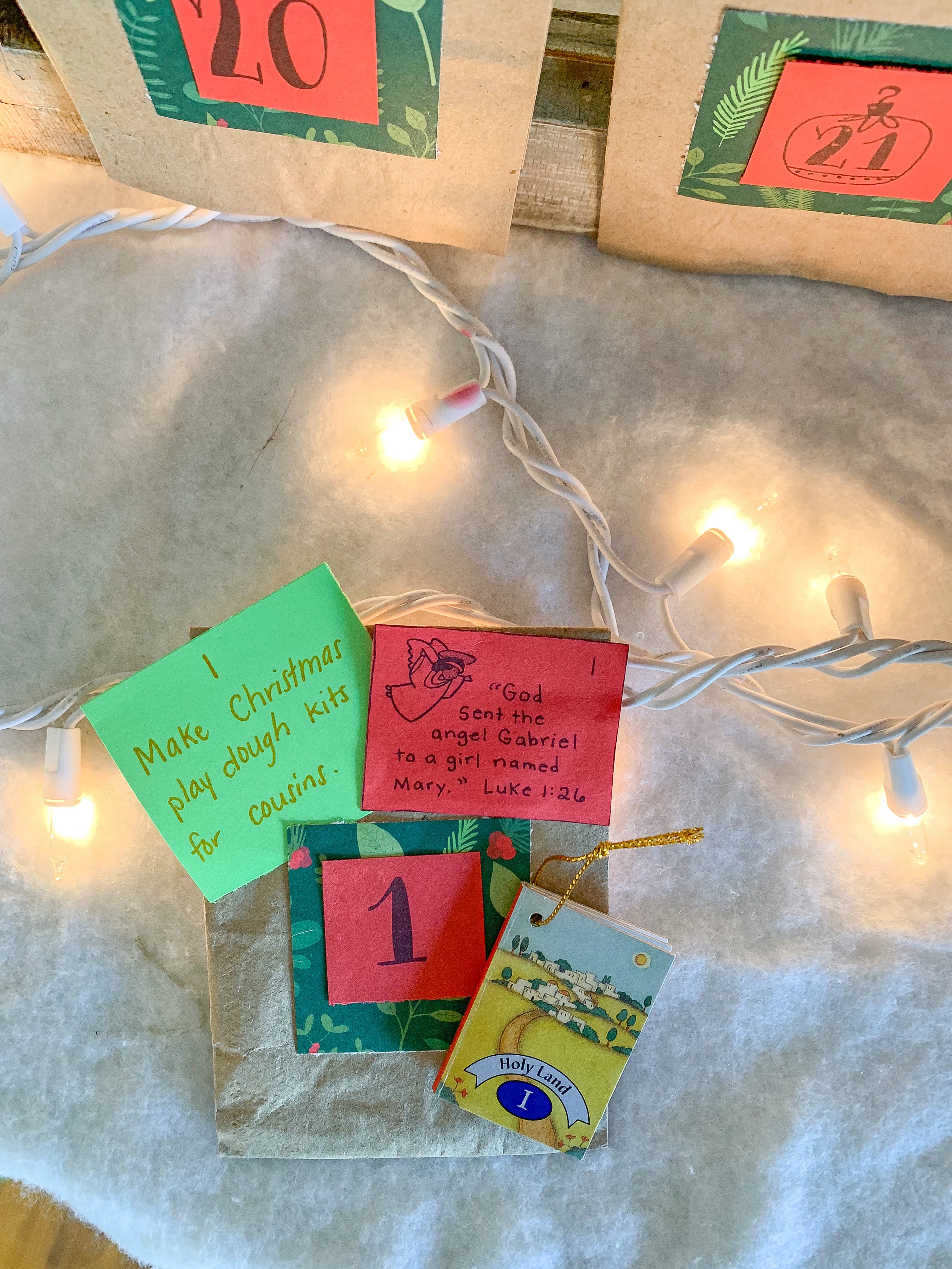 Most days in December, my elementary-aged kid’s school requirement is just one math and reading lesson…the rest gets put on hold until the new year. Then at mid-morning, we gather together to do Christmas School. This consists of Bible readings following the Jesus Storybook Bible Advent Reading Plan, verse and catechism memorization, our daily Advent activity from inside the bags, and going through the Christmas School curriculum (which usually consists of learning a character trait, reading lots of good Christmas books, and any crafts or activities that go with that week’s theme).