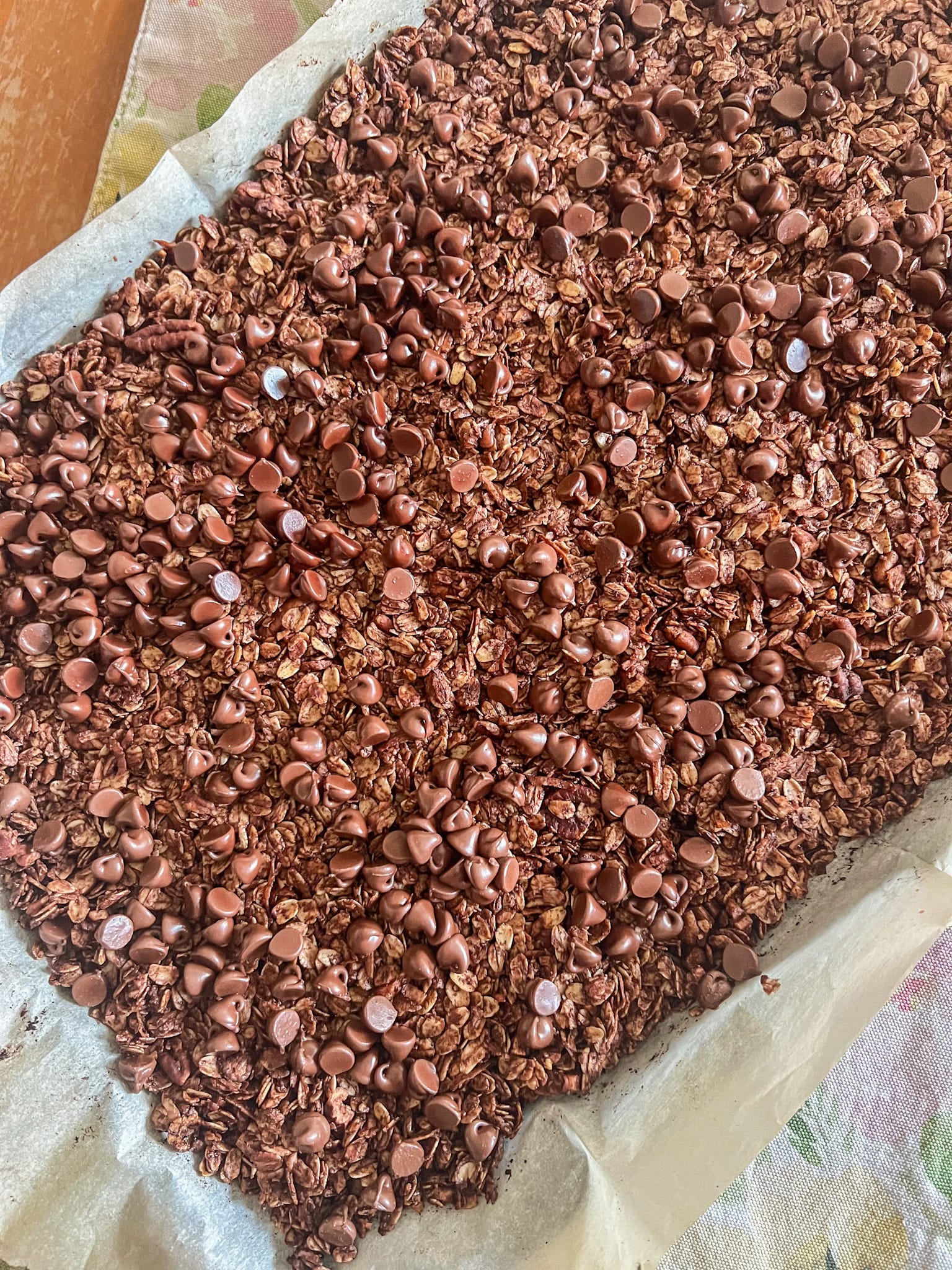 After removing from the oven, use a spatula to spread the melted chocolate chips over the granola (this makes the best chocolatey clusters!).