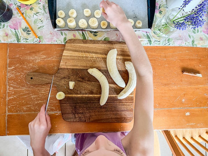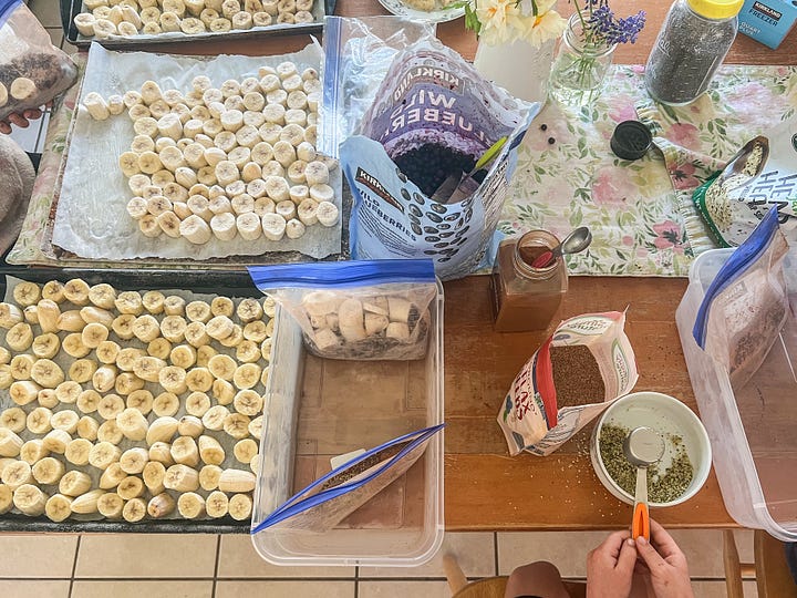 Since gathering all 10 ingredients every morning isn’t exactly realistic or simple, I make smoothie bags once a month. I buy about 60 ripe bananas (yes, I get some odd looks at the grocery store!), have the kids slice them, and flash freeze them on cookie sheets. Then we bag up everything that can be frozen together.