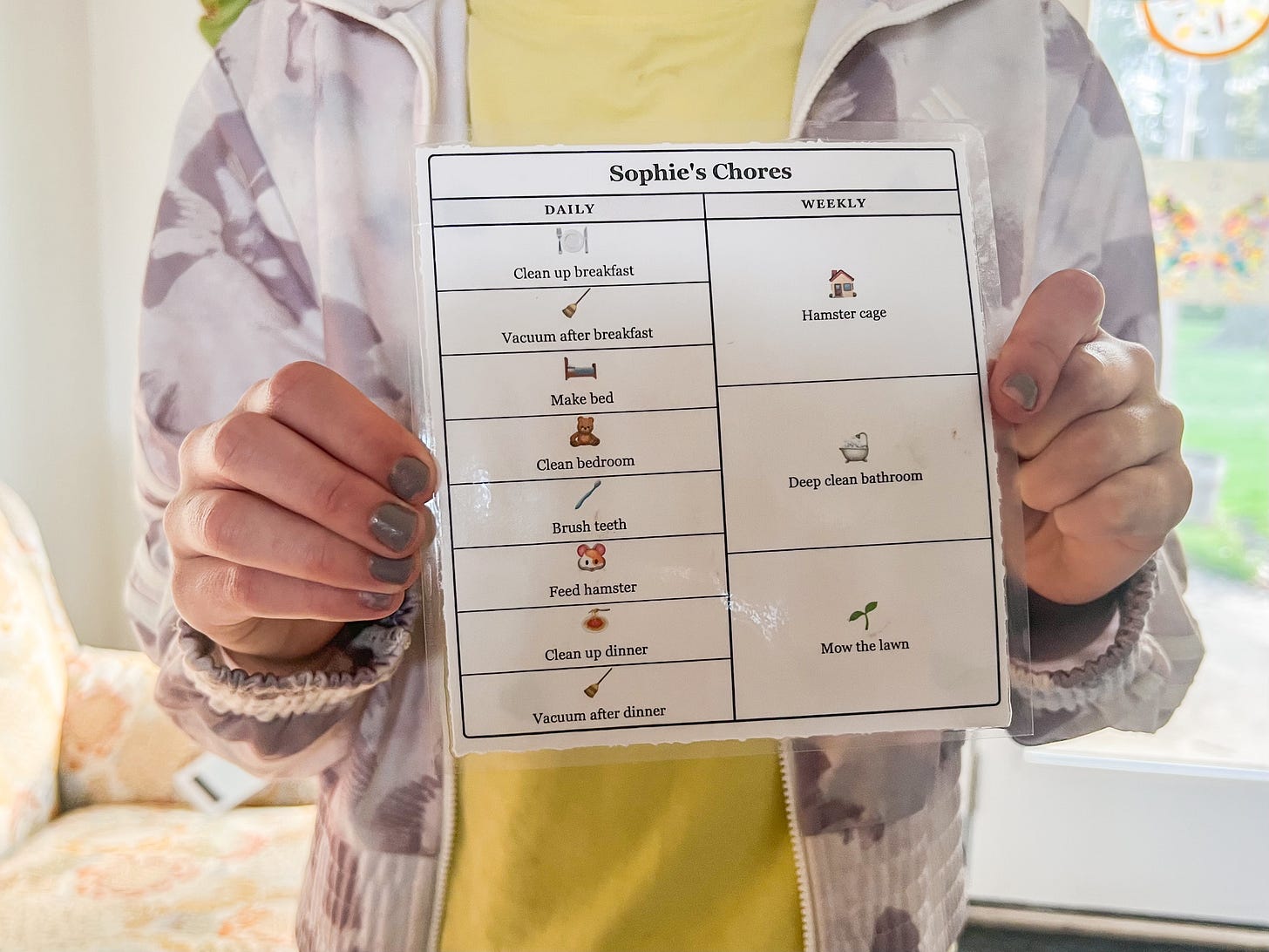 -Our 6-year-old takes out the recycling, cleans the kitchen chairs, tidies up the bedroom, and makes his bed.